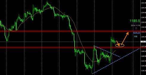 周一(11月17日)美元指数先跌后张,收出阳线形态,但总体来说还是在震荡区间里面和小时图高位上升楔形跌破后的反测区域中。美指后市择机短线看跌为主。现货黄金自周五的大幅拉升后高位盘整整固,早间开盘1186.0美元/盎司,最低下探1181.1美元/盎司,最高上测1194.3美元/盎司,最终收盘1186.3美元/盎司。黄金ETF持仓量迎来本月来的首次增仓2.39吨,有望进一步企稳上升。