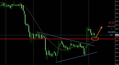 白银上周五如预期成功突破震荡三角形上边缘后展开大幅上涨。白银今日逢低买入看涨白银期权为主。在16.10-16.00附近企稳看涨,目标看16.50到16.85附近。白银走势图: